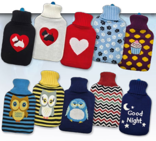 TERMOFOR W DZIANINOWYM POKROWCU 2 L DEPAN (wzory piesek białe tło ,serce czerwone tło,good night/