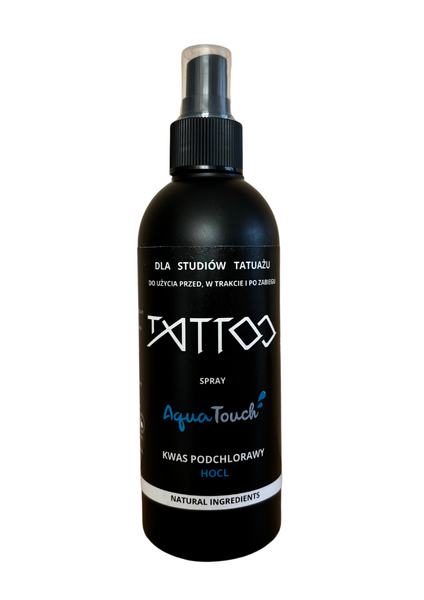 AquaTouch tattoo to spray posiadający w  100% naturalny skład, przeznaczony do użytku w trakcie wykonywania zabiegu tataużu. Zawarty kwas podchlorawy HOCL posiada właściwości antybakteryjne, przeciwwirusowe i antyzapalne.