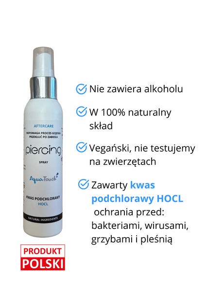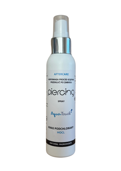 AquaTouch piercing to spray posiadający w  100% naturalny skład, przeznaczony do pielęgnacji zabiegu piercingu. Zawarty kwas podchlorawy HOCL posiada właściwości antybakteryjne, przeciwwirusowe i antyzapalne.